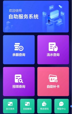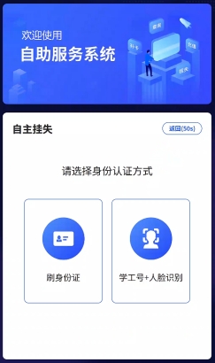 点击屏幕主页“自主挂失”,然后选择“身份认证方式”进行认证。建议使用身份证进行挂失。然后根据提示进行操作挂失。