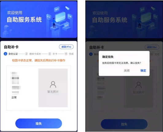 2.没有挂失的,会提示挂失,点击“挂失”,然后点击“确定”,补卡后卡密码会重置,补卡成功后建议立即修改密码。