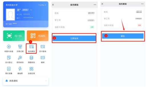 操作步骤:打开贵州民族大学微信公众号,点击“校园服务”→点击“一卡通”→“挂失解挂”进行挂失。