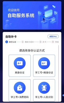 1.点击自助补卡机屏幕上“自助补卡”,选择身份认证方式,建议使用身份证。