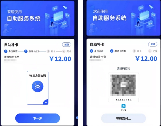 3.点击“下一步”,屏幕上会显示出支付二维码,打开支付宝扫一扫进行扫码支付。支付成功后补卡机会打印卡片,打印完成后卡片后掉到机子前面“发卡出口”凹槽处。